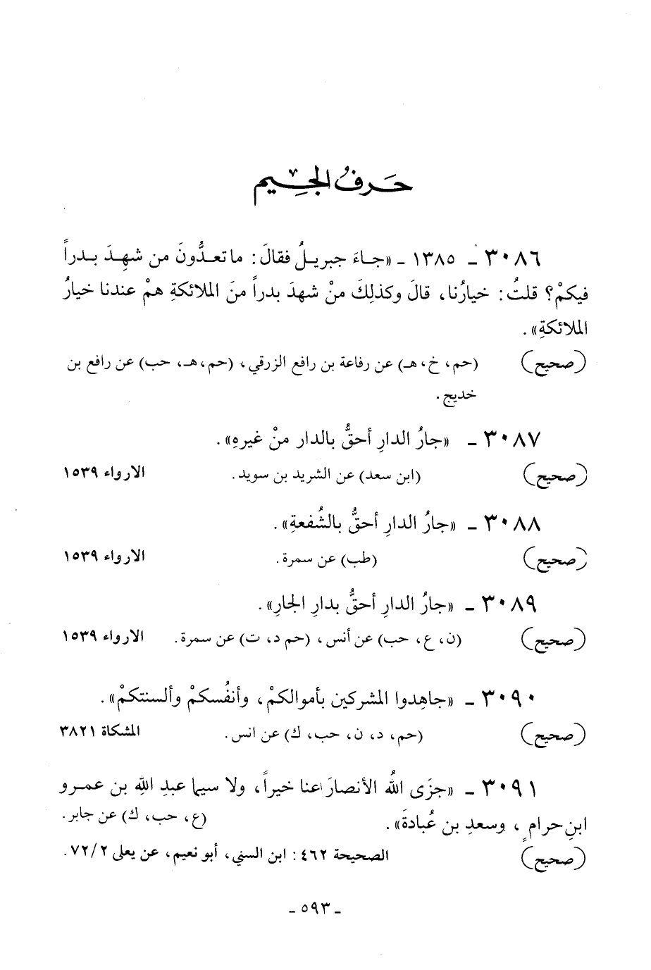 3086 - 1385 - «جاء جبريل فقال: ما تعدون من شهد بدرا فيكم؟ قلت: خيارنا قال وكذلك من شهد بدرا من الملائكة هم عندنا خيار الملائكة» .