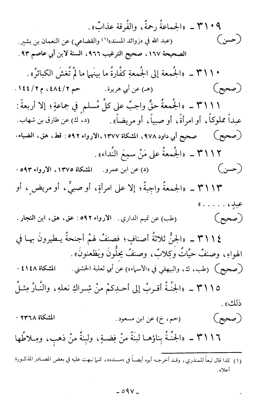 3113 - «الجمعة واجبة إلا على: امرأة أو صبي أو مريض أو عبد.. ... » .