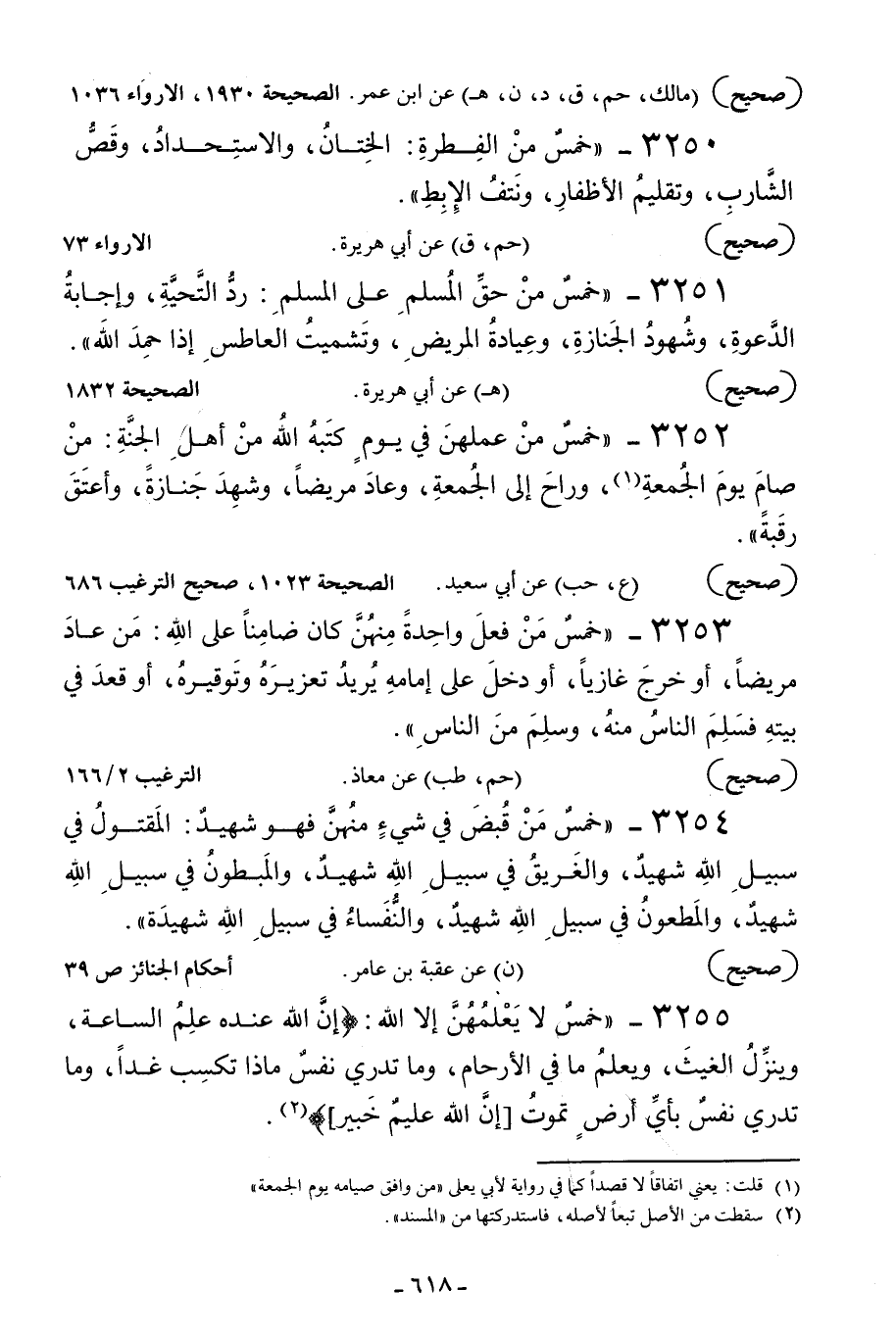 3253 - «خمس من فعل واحدة منهن كان ضامنا على الله: من عاد مريضا أو خرج غازيا أو دخل على إمامه يريد تعزيره وتوقيره أو قعد في بيته فسلم الناس منه وسلم من الناس» .