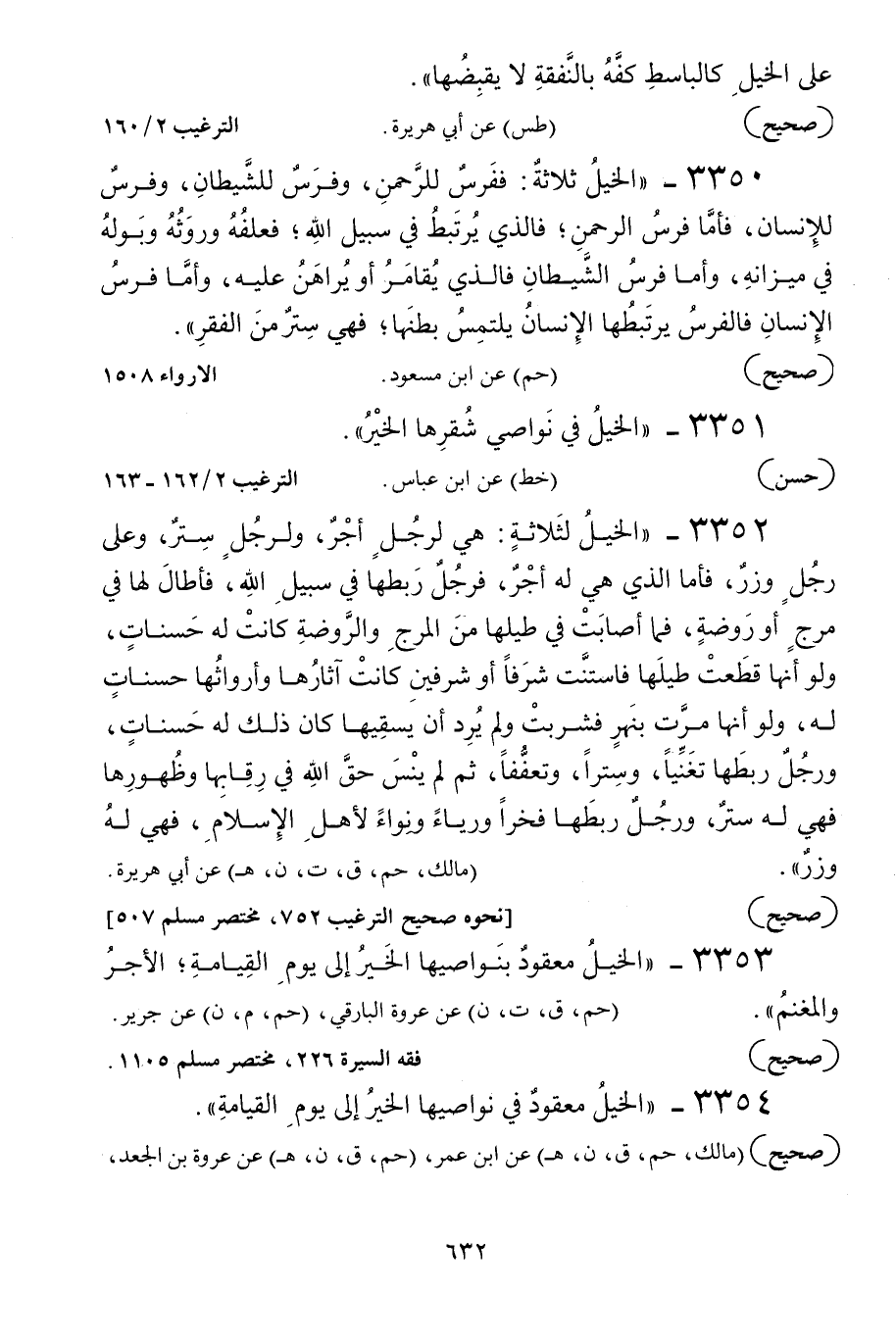3353 - «الخيل معقود بنواصيها الخير إلى يوم القيامة الأجر والمغنم» .