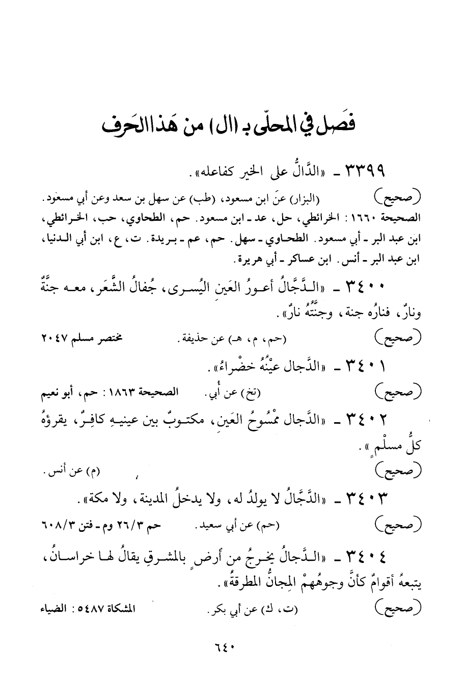 3400 - «الدجال أعور العين اليسرى جفال الشعر معه جنة ونار فناره جنة وجنته نار» .