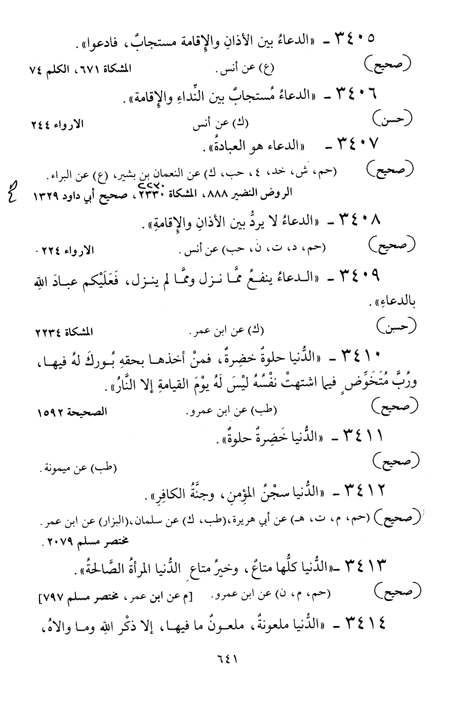 3405 - «الدعاء بين الأذان والإقامة مستجاب فادعوا» .