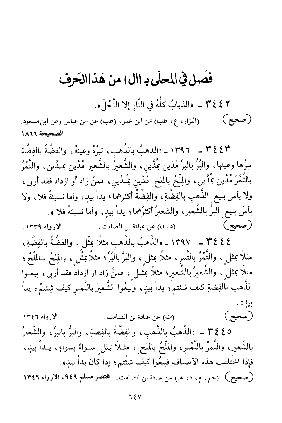 3445 - «الذهب بالذهب والفضة بالفضة والبر بالبر والشعير بالشعير والتمر بالتمر والملح بالملح مثلا بمثل سواء بسواء يدا بيد فإذا اختلفت هذه الأصناف فبيعوا كيف شئتم إذا كان يدا بيد» .