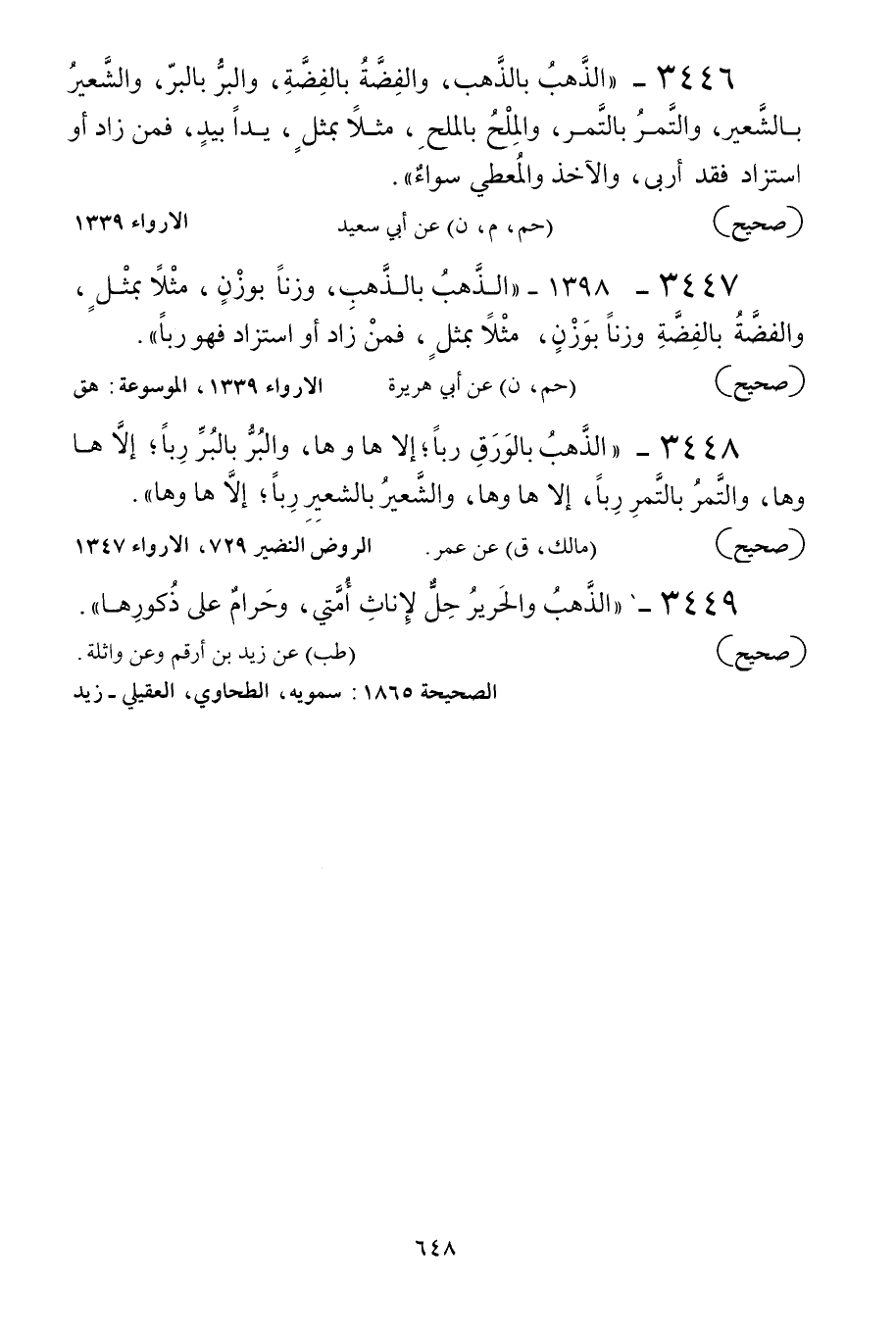 3446 - «الذهب بالذهب والفضة بالفضة والبر بالبر والشعير بالشعير والتمر بالتمر والملح بالملح مثلا بمثل يدا بيد فمن زاد أو استزاد فقد أربى والآخذ والمعطي سواء» .