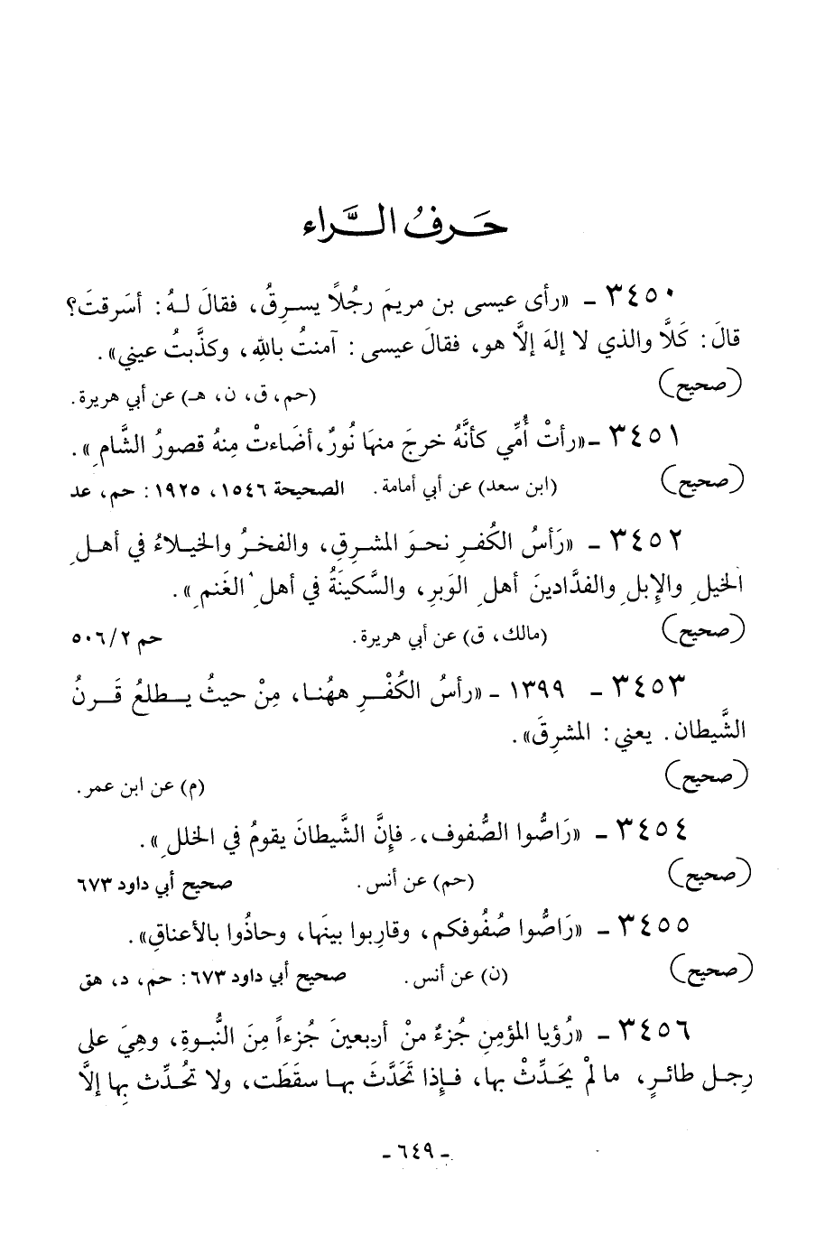 3452 - «رأس الكفر نحو المشرق والفخر والخيلاء في أهل الخيل والإبل والفدادين أهل الوبر والسكينة في أهل الغنم» .