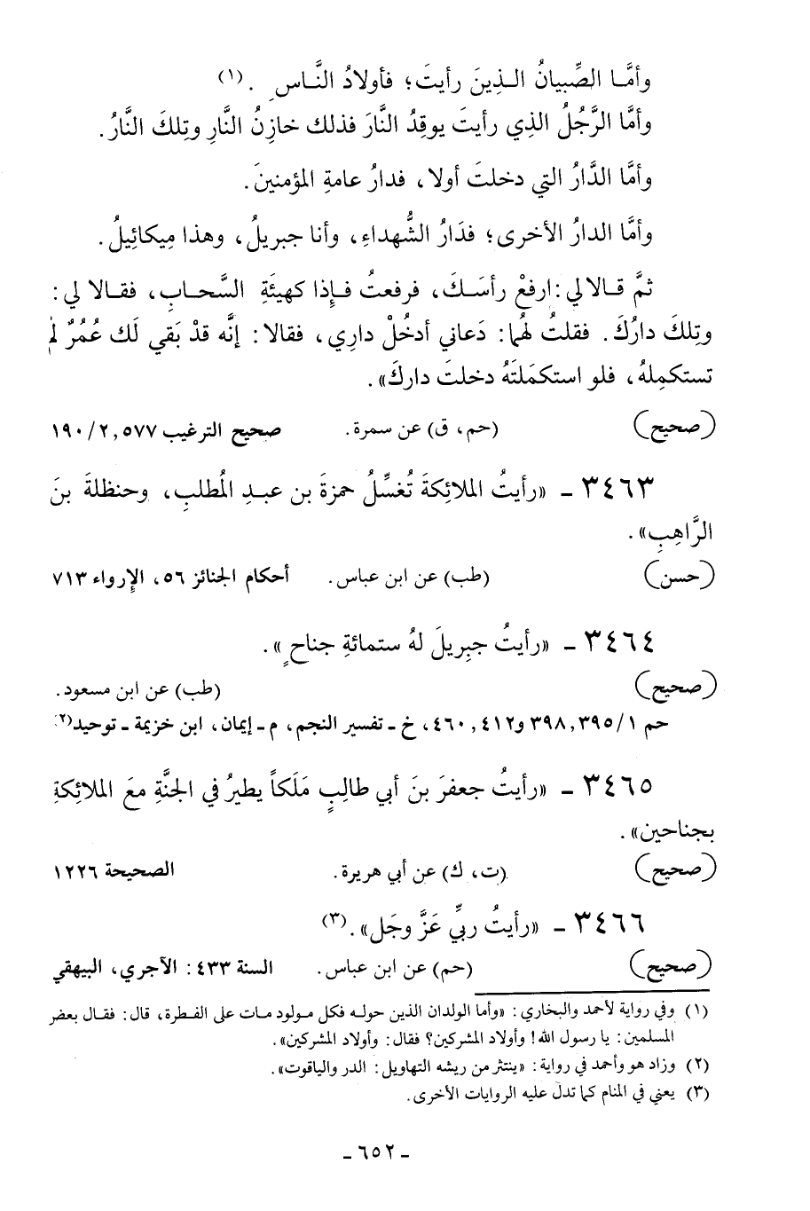 3465 - «رأيت جعفر بن أبي طالب ملكا يطير في الجنة مع الملائكة بجناحين» .