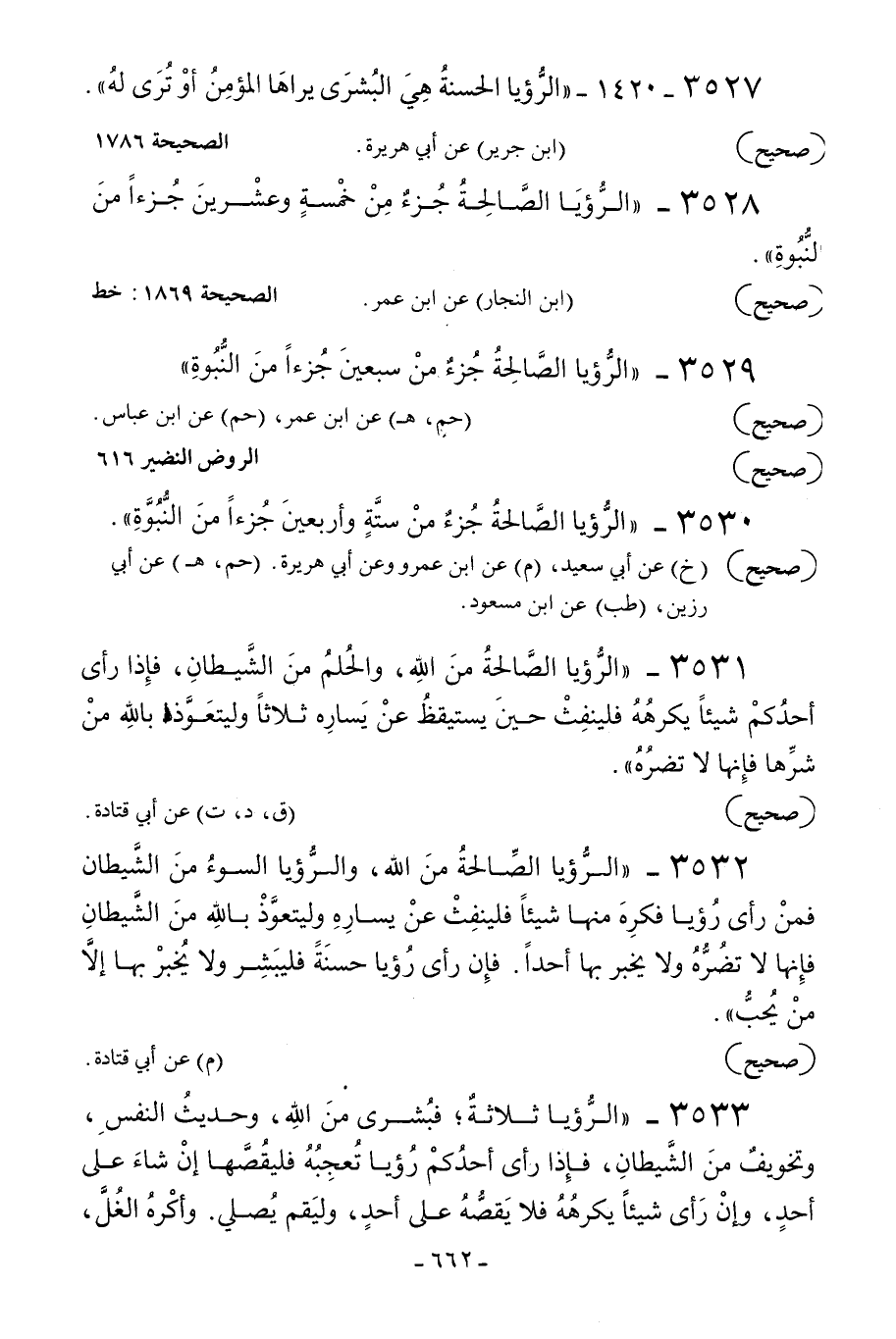 3528 - «الرؤيا الصالحة جزء من خمسة وعشرين جزءا من النبوة» .