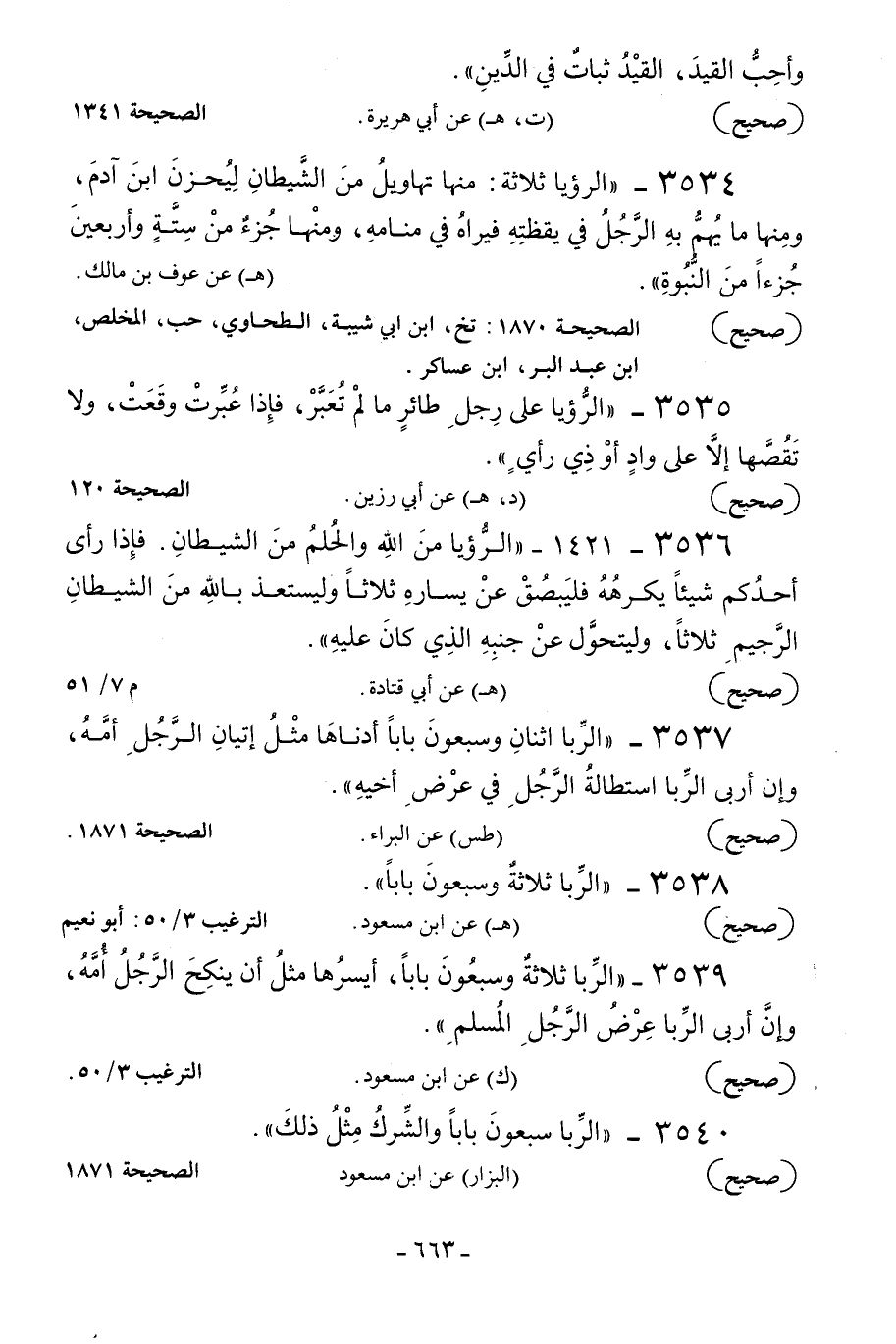3539 - «الربا ثلاثة وسبعون بابا أيسرها مثل أن ينكح الرجل أمه وإن أربى الربا عرض الرجل المسلم» .