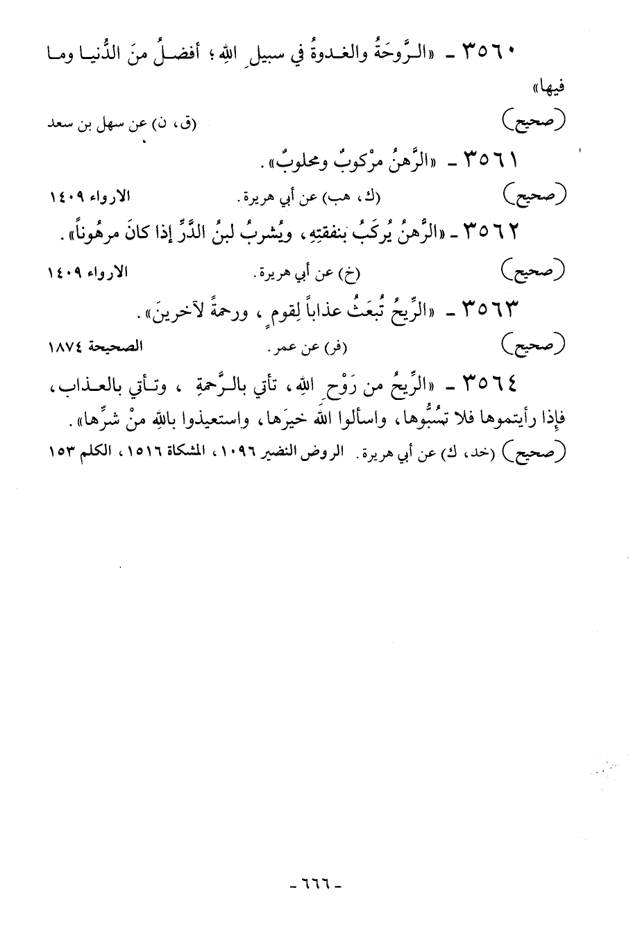 3564 - «الريح من روح الله تأتي بالرحمة وتأتي بالعذاب فإذا رأيتموها فلا تسبوها واسألوا الله خيرها واستعيذوا بالله من شرها» .