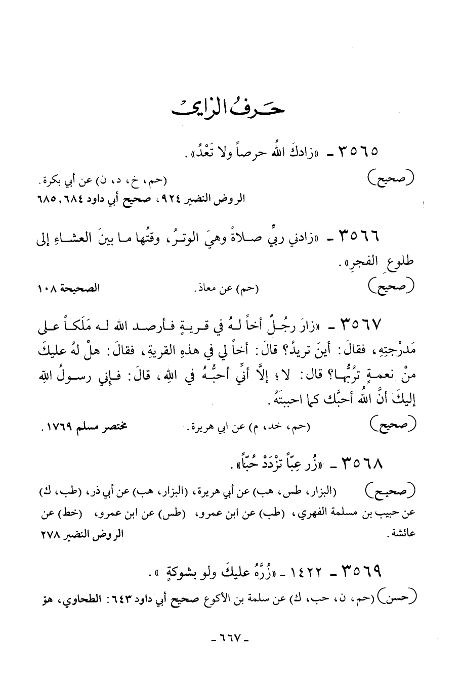 3567 - «زار رجل أخا له في قرية فأرصد الله له ملكا على مدرجته فقال: أين تريد؟ قال: أخا لي في هذه القرية فقال: هل له عليك من نعمة تربها؟ قال: لا إلا أني أحبه في الله قال: فإني رسول الله إليك أن الله أحبك كما أحببته» .