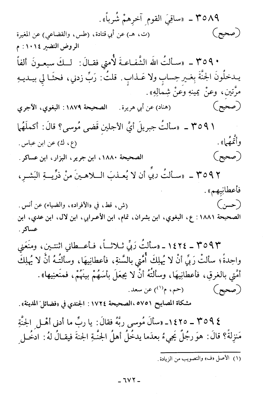 3590 - «سألت الله الشفاعة لأمتي فقال: لك سبعون ألفا يدخلون الجنة بغير حساب ولا عذاب قلت: رب زدني فحثا لي بيديه مرتين وعن يمينه وعن شماله» .