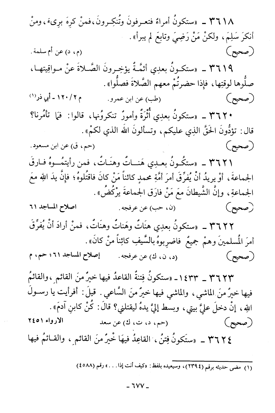 3618 - «ستكون أمراء فتعرفون وتنكرون فمن كره برئ ومن أنكر سلم ولكن من رضي وتابع لم يبرأ» .