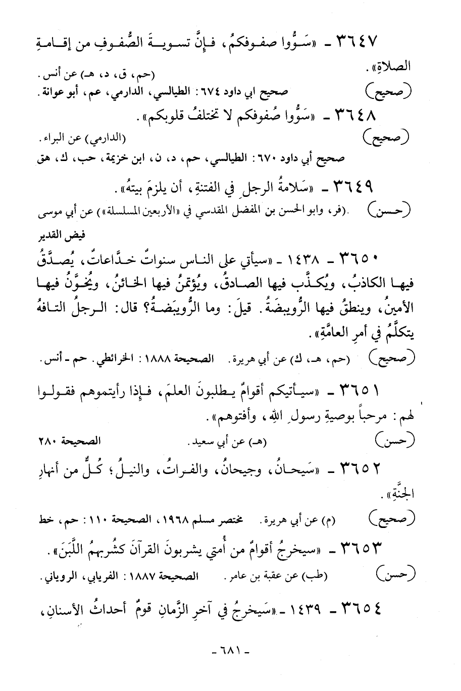 3647 - «سووا صفوفكم فإن تسوية الصفوف من إقامة الصلاة» .