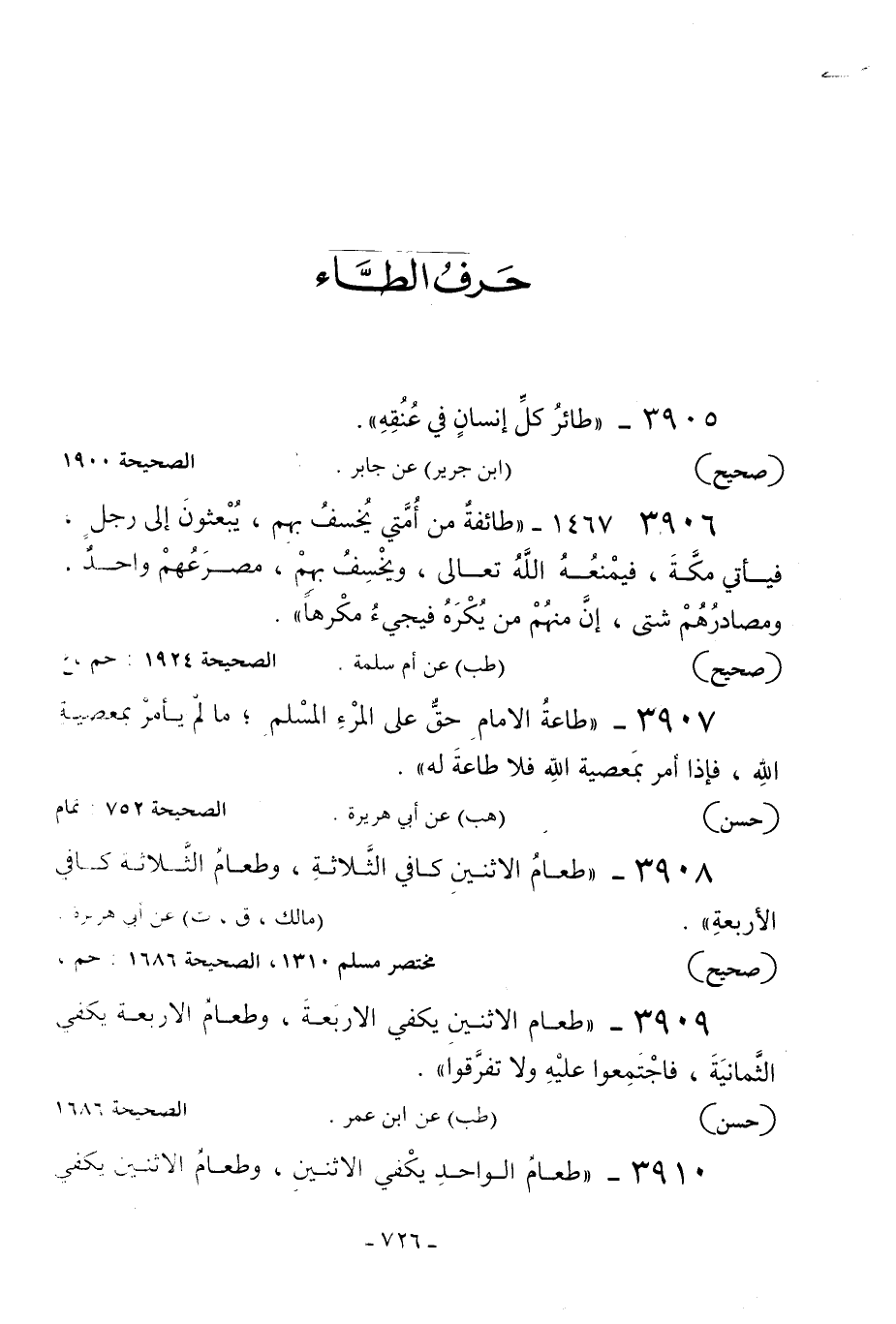 3909 - «طعام الاثنين يكفي الأربعة وطعام الأربعة يكفي الثمانية فاجتمعوا عليه ولا تفرقوا» .