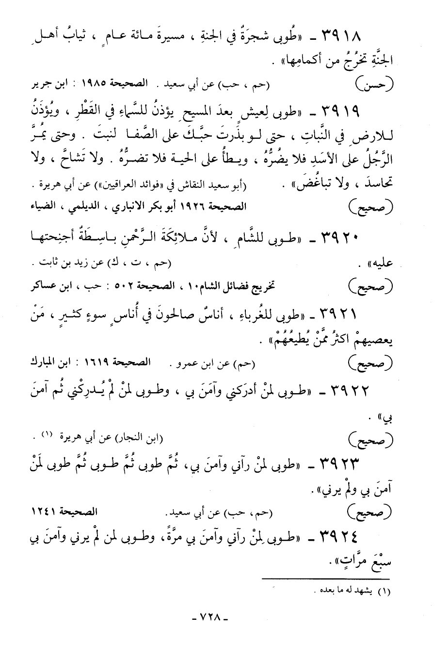 3924 - «طوبى لمن رآني وآمن بي مرة وطوبى لمن لم يرني وآمن بي سبع مرات» .
