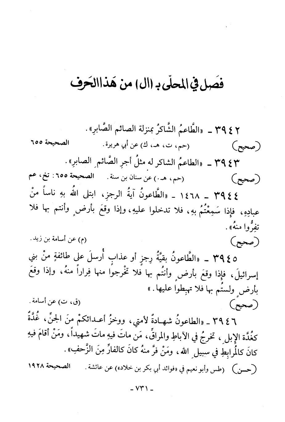 3945 - «الطاعون بقية رجز أو عذاب أرسل على طائفة من بني إسرائيل فإذا وقع بأرض وأنتم بها فلا تخرجوا منها فرارا منه وإذا وقع بأرض ولستم بها فلا تهبطوا عليها» .