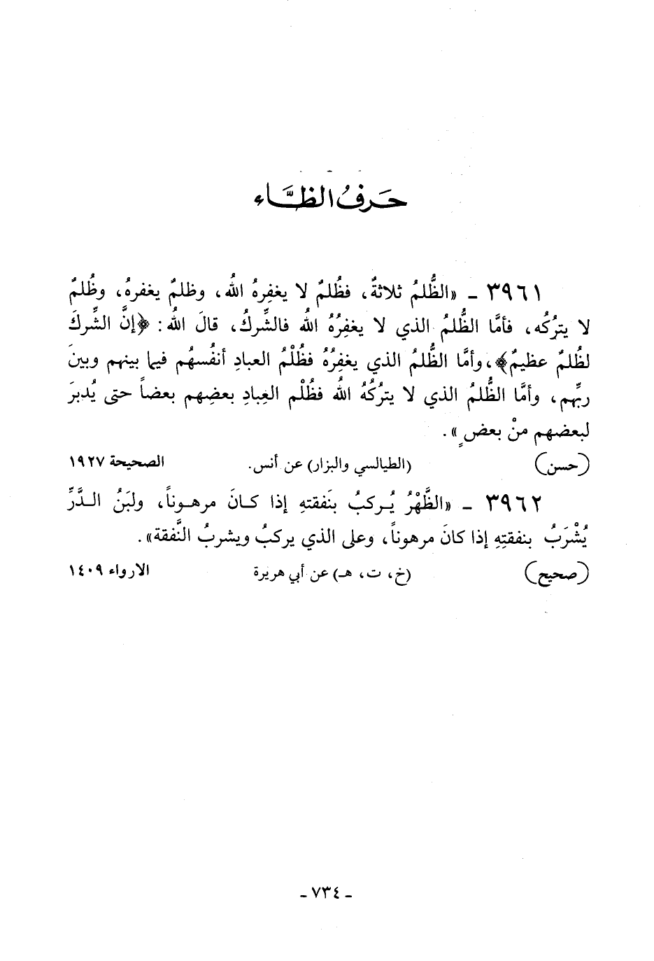 3961 - «الظلم ثلاثة فظلم لا يغفره الله وظلم يغفره وظلم لا يتركه فأما الظلم الذي لا يغفره الله فالشرك قال الله: {إِنَّ الشِّرْكَ لَظُلْمٌ عَظِيمٌ} , وأما الظلم الذي يغفره فظلم العباد أنفسهم فيما بينهم وبين ربهم وأما الظلم الذي لا يتركه الله فظلم العباد بعضهم بعضا حتى يدبر لبعضهم من بعض» .