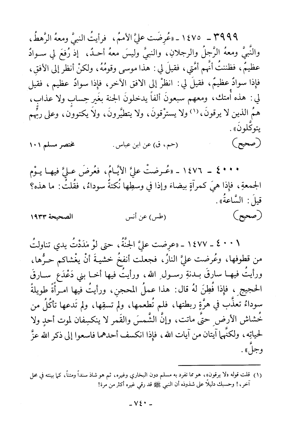 3999 - 1475 - «عرضت علي الأمم فرأيت النبي ومعه الرهط والنبي ومعه الرجل والرجلان والنبي وليس معه أحد إذ رفع لي سواد عظيم فظننت أنهم أمتي فقيل لي: هذا موسى وقومه ولكن انظر إلى الأفق فإذا سواد عظيم فقيل لي: انظر إلى الأفق الآخر فإذا سواد عظيم فقيل لي: هذه أمتك ومعهم سبعون ألفا يدخلون الجنة بغير حساب ولا عذاب هم الذين لا يرقون1 ولا يسترقون ولا يتطيرون ولا يكتوون وعلى ربهم يتوكلون» .