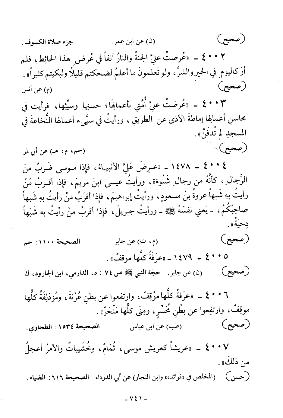 4006 - «عرفة كلها موقف وارتفعوا عن بطن عرنة ومزدلفة كلها موقف وارتفعوا عن بطن محسر ومنى كلها منحر» .