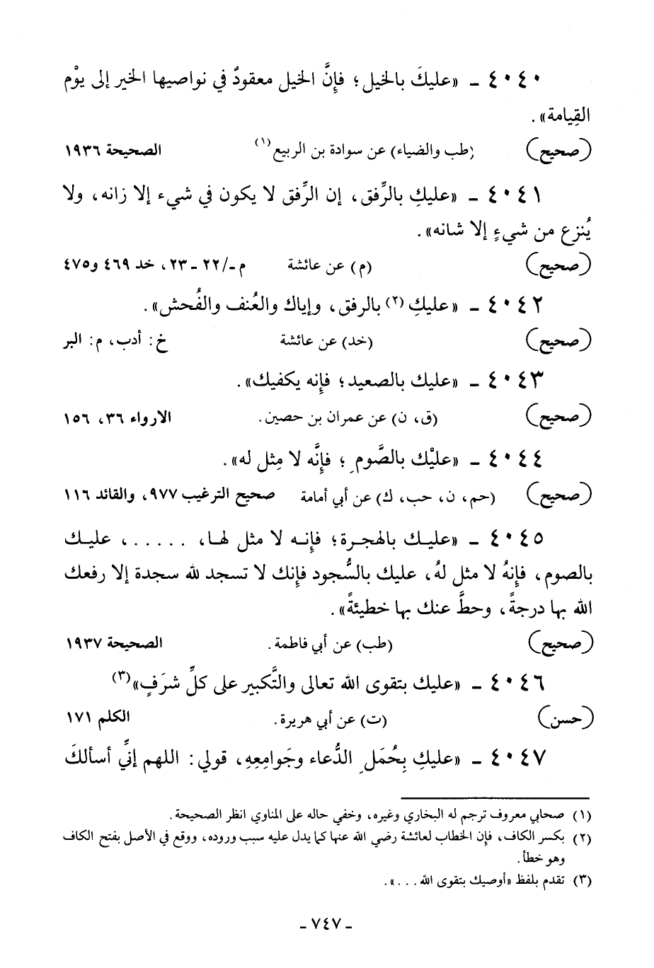 4045 - «عليك بالهجرة فإنه لا مثل لها» عليك بالجهاد فإنه لا مثل لها.....، عليك بالصوم فإنه لا مثل له عليك بالسجود فإنك لا تسجد لله سجدة إلا رفعك الله بها درجة وحط عنك بها خطيئة".