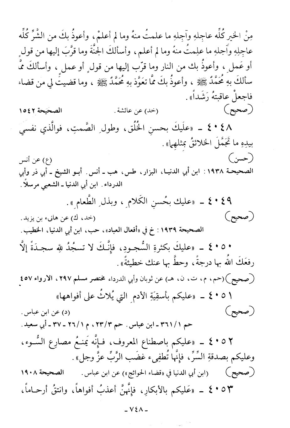 4048 - «عليك بحسن الخلق وطول الصمت فوالذي نفسي بيده ما تجمل الخلائق بمثلهما» .