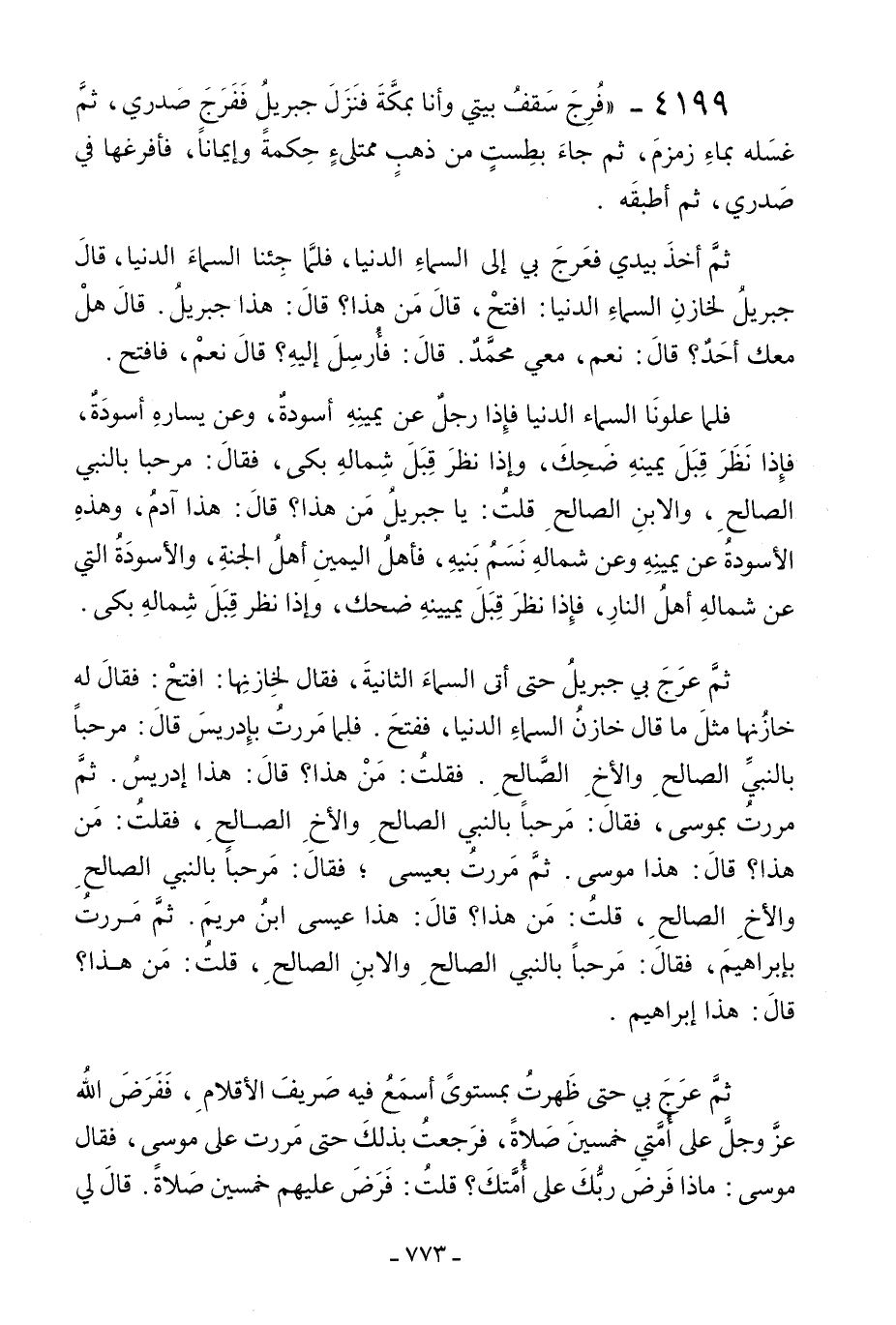 4199 - "فرج سقف بيتي وأنا بمكة فنزل جبريل ففرج صدري ثم غسله بماء زمزم ثم جاء بطست من ذهب ممتلئ حكمة وإيمانا فأفرغها في صدري ثم أطبقه.