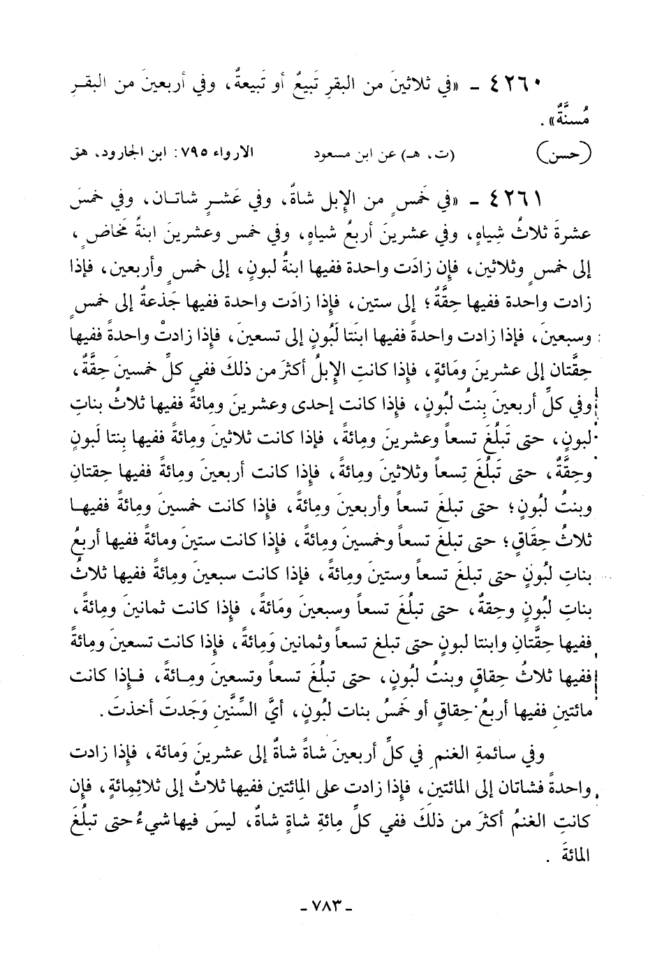 4260 - «في ثلاثين من البقر تبيع أو تبيعة وفي أربعين من البقر مسنة» .