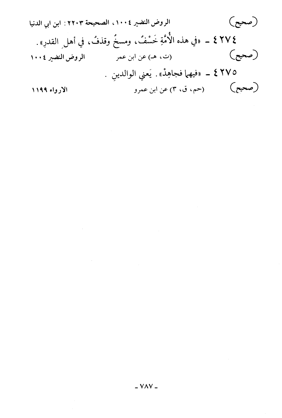 4274 - «في هذه الأمة خسف ومسخ وقذف في أهل القدر» .