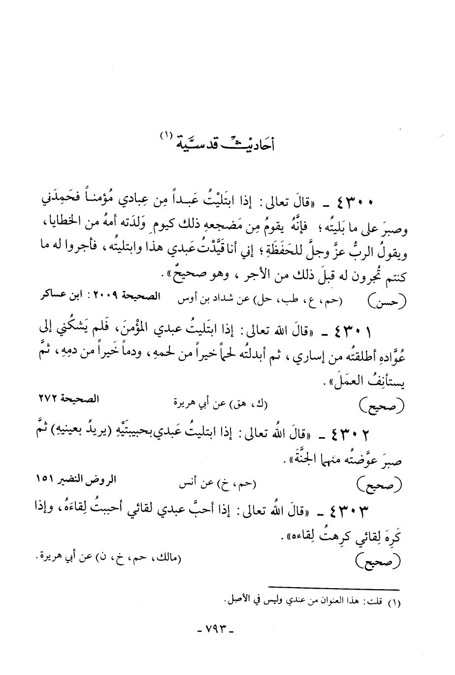 4302 - «قال الله تعالى: إذا ابتليت عبدي بحبيبتيه - يريد بعينيه - ثم صبر عوضته منهما الجنة» .