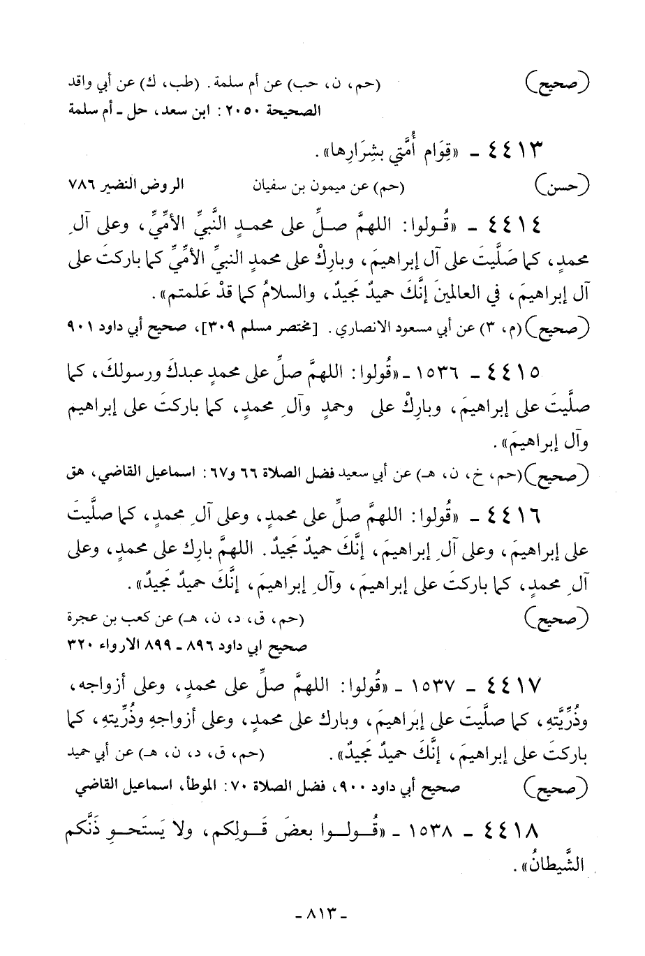 4416 - «قولوا: اللهم صل على محمد وعلى آل محمد كما صليت على إبراهيم وعلى آل إبراهيم إنك حميد مجيد اللهم بارك على محمد وعلى آل محمد كما باركت على إبراهيم وآل إبراهيم إنك حميد مجيد» .