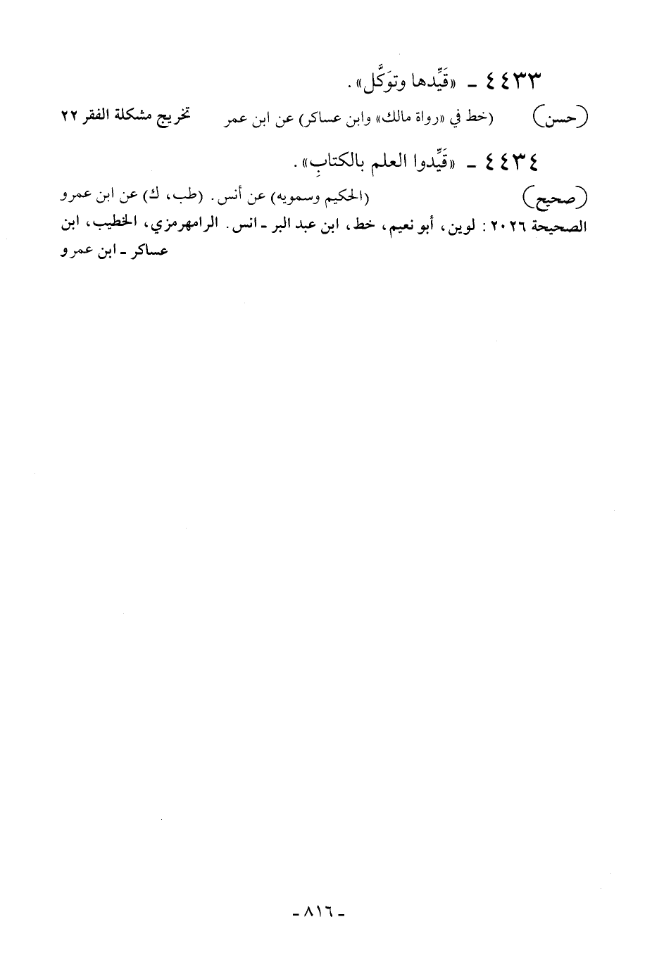 (صحيح) [الحكيم سمويه] عن أنس [طب ك] عن ابن عمرو. الصحيحة 2026: لوين، أبو نعيم، خط، ابن عبد البر - أنس. الرامهرمزي، الخطيب، ابن عساكر - ابن عمرو.