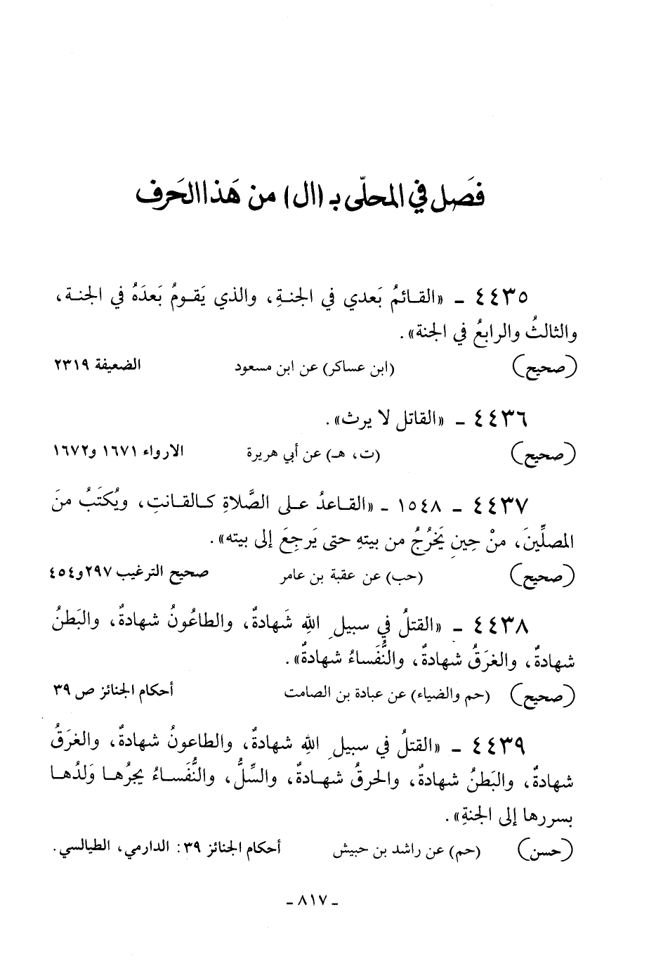 4438 - «القتل في سبيل الله شهادة والطاعون شهادة والبطن شهادة والغرق شهادة والنفساء شهادة» .