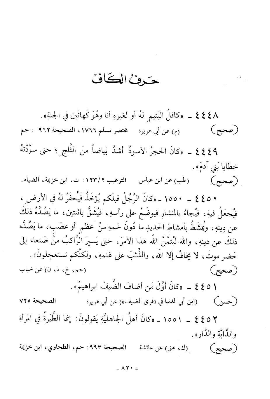 4450 - 1550 - «كان الرجل قبلكم يؤخذ فيحفر له في الأرض فيجعل فيه فيجاء بالمنشار فيوضع على رأسه فيشق باثنتين ما يصده ذلك عن دينه ويمشط بأمشاط الحديد ما دون لحمه من عظم أو عصب ما يصده ذلك عن دينه والله ليتمن الله هذا الأمر حتى يسير الراكب من صنعاء إلى حضرموت لا يخاف إلا الله والذئب على غنمه ولكنكم تستعجلون» .