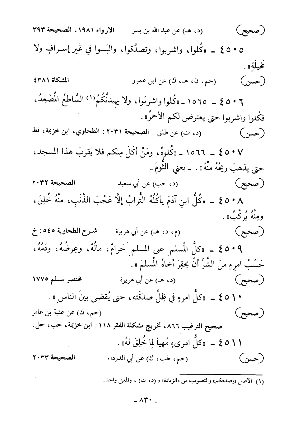 4505 - «كلوا واشربوا وتصدقوا والبسوا في غير إسراف ولا مخيلة» .