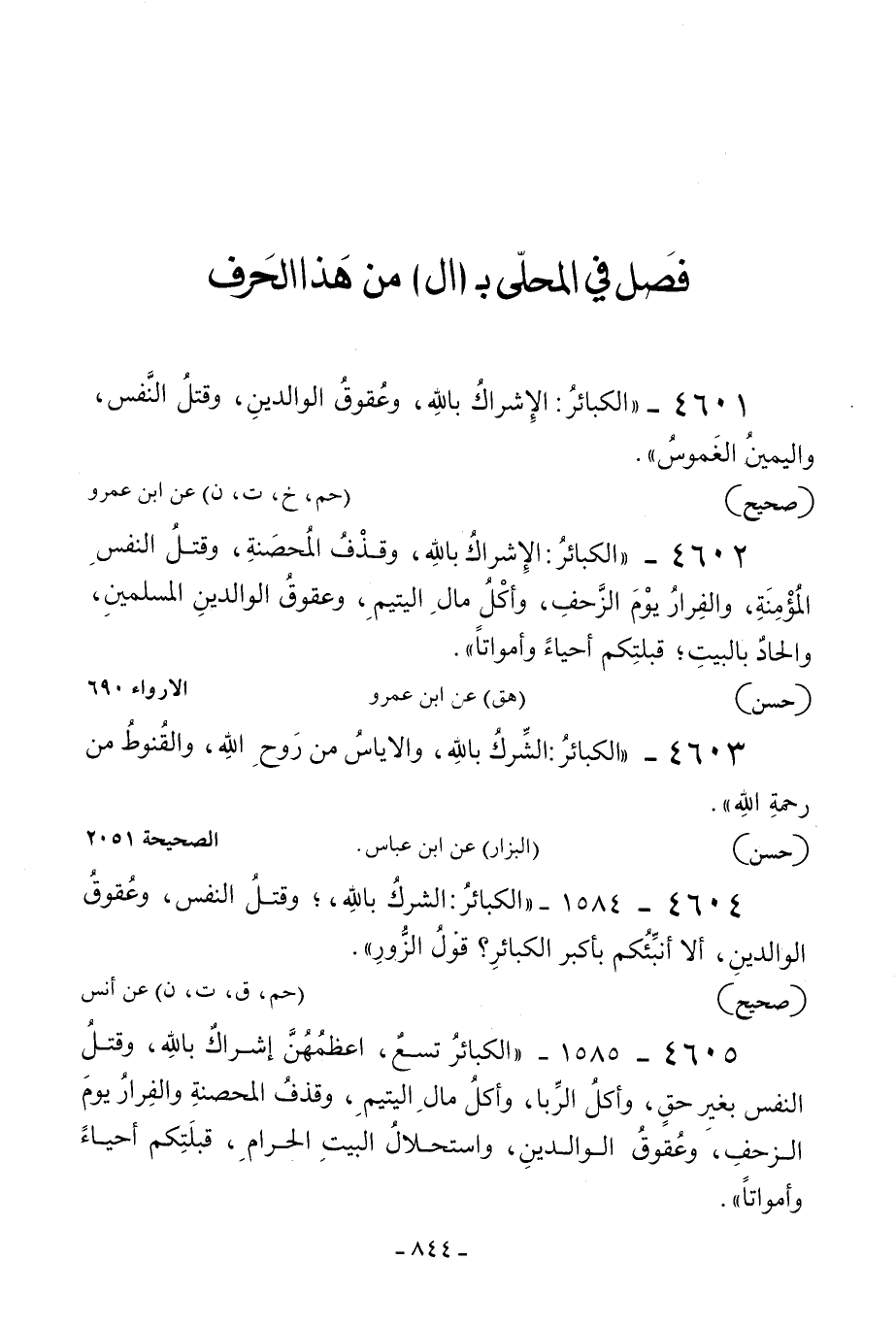 4602 - «الكبائر: الإشراك بالله وقذف المحصنة وقتل النفس المؤمنة والفرار يوم الزحف وأكل مال اليتيم وعقوق الوالدين المسلمين وإلحاد بالبيت قبلتكم أحياء وأمواتا» .