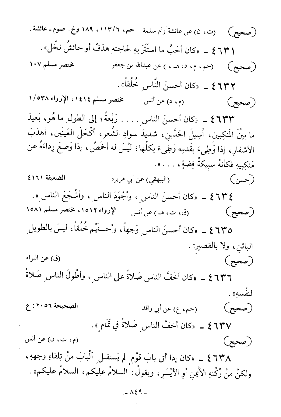 4633 - «كان أحسن الناس» صفة وأجملها كان ربعة إلى الطول ما هوبعيد ما بين المنكبين أسيل الخدين شديد سواد الشعر أكحل العينين أهدب الأشفار إذا وطئ بقدمه وطئ بكلها ليس له أخمص إذا وضع رداءه عن منكبيه فكأنه سبيكة فضة،.. ... "