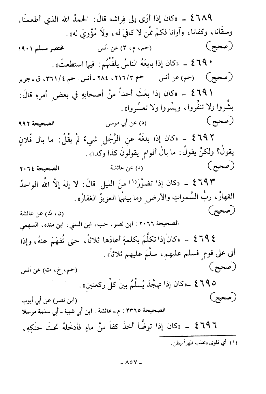 4689 - «كان إذا أوى إلى فراشه قال: الحمد لله الذي أطعمنا وسقانا وكفانا وأوانا فكم ممن لا كافي له ولا مؤوي له» .