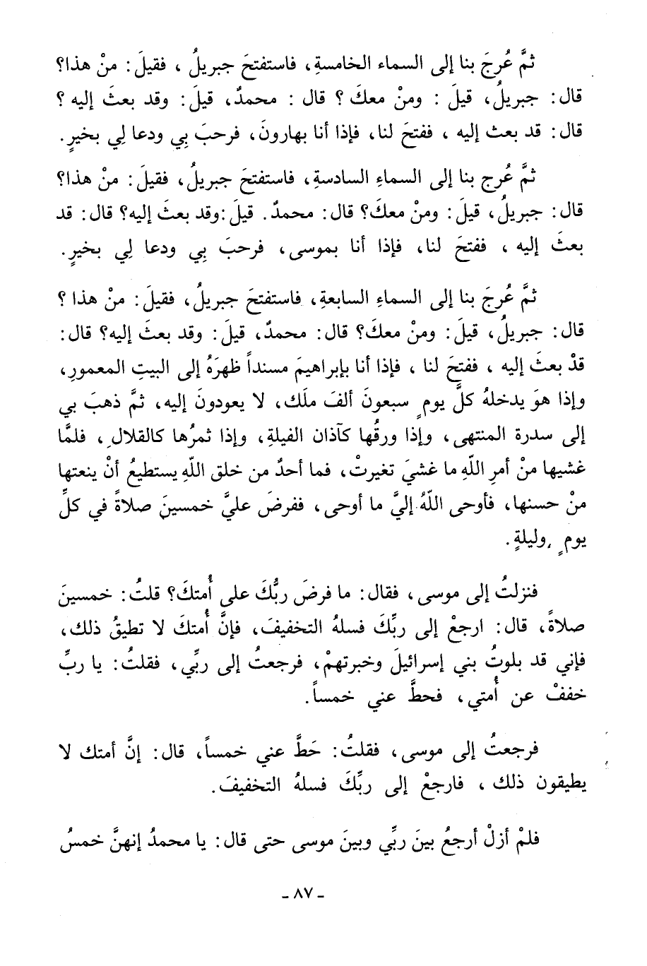 ثم عرج بنا إلى السماء الخامسة فاستفتح جبريل فقيل: من هذا؟ قال: جبريل قيل: ومن معك؟ قال: محمد قيل: وقد بعث إليه؟ قال: قد بعث إليه ففتح لنا فإذا أنا بهارون فرحب بي ودعا لي بخير; ثم عرج بنا إلى السماء السادسة فاستفتح جبريل فقيل: من هذا؟ قال: جبريل قيل: ومن معك؟ قال: محمد قيل: وقد بعث إليه؟ قال: قد بعث إليه ففتح لنا فإذا أنا بموسى فرحب بي ودعا لي بخير, ثم عرج بنا إلى السماء السابعة فاستفتح جبريل فقيل: من هذا؟ قال: جبريل قيل: ومن معك؟ قال: محمد قيل: وقد بعث إليه؟ قال: قد بعث إليه ففتح لنا فإذا أنا بإبراهيم مسندا ظهره إلى البيت المعمور وإذا هو يدخله كل يوم سبعون ألف ملك لا يعودون إليه, ثم ذهب بي إلى سدرة المنتهى وإذا ورقها كآذان الفيلة وإذا ثمرها كالقلال فلما غشيها من أمر الله ما غشي تغيرت فما أحد من خلق الله يستطيع أن ينعتها من حسنها, فأوحى الله إلي ما أوحى ففرض علي خمسين صلاة في كل يوم وليلة;