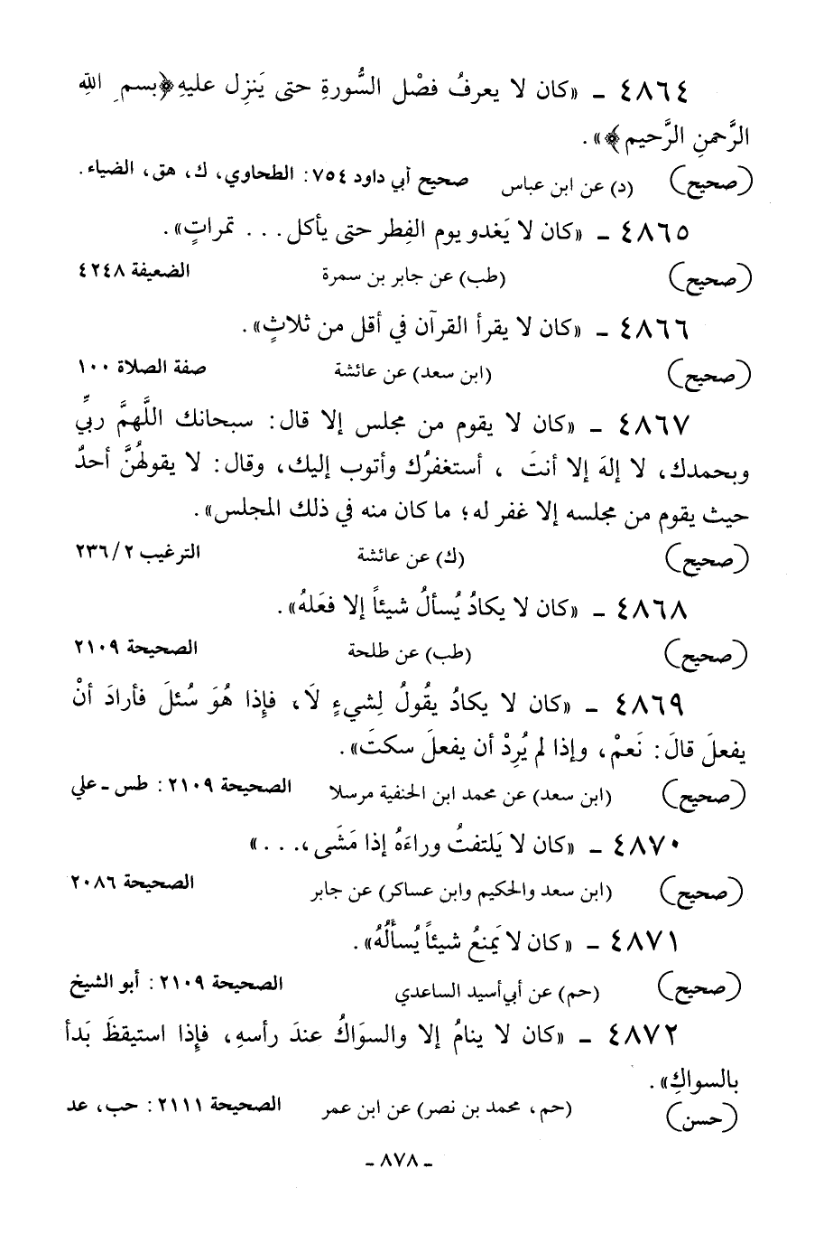 4869 - «كان لا يكاد يقول لشيء لا فإذا هوسئل فأراد أن يفعل قال: نعم وإذا لم يرد أن يفعل سكت» .