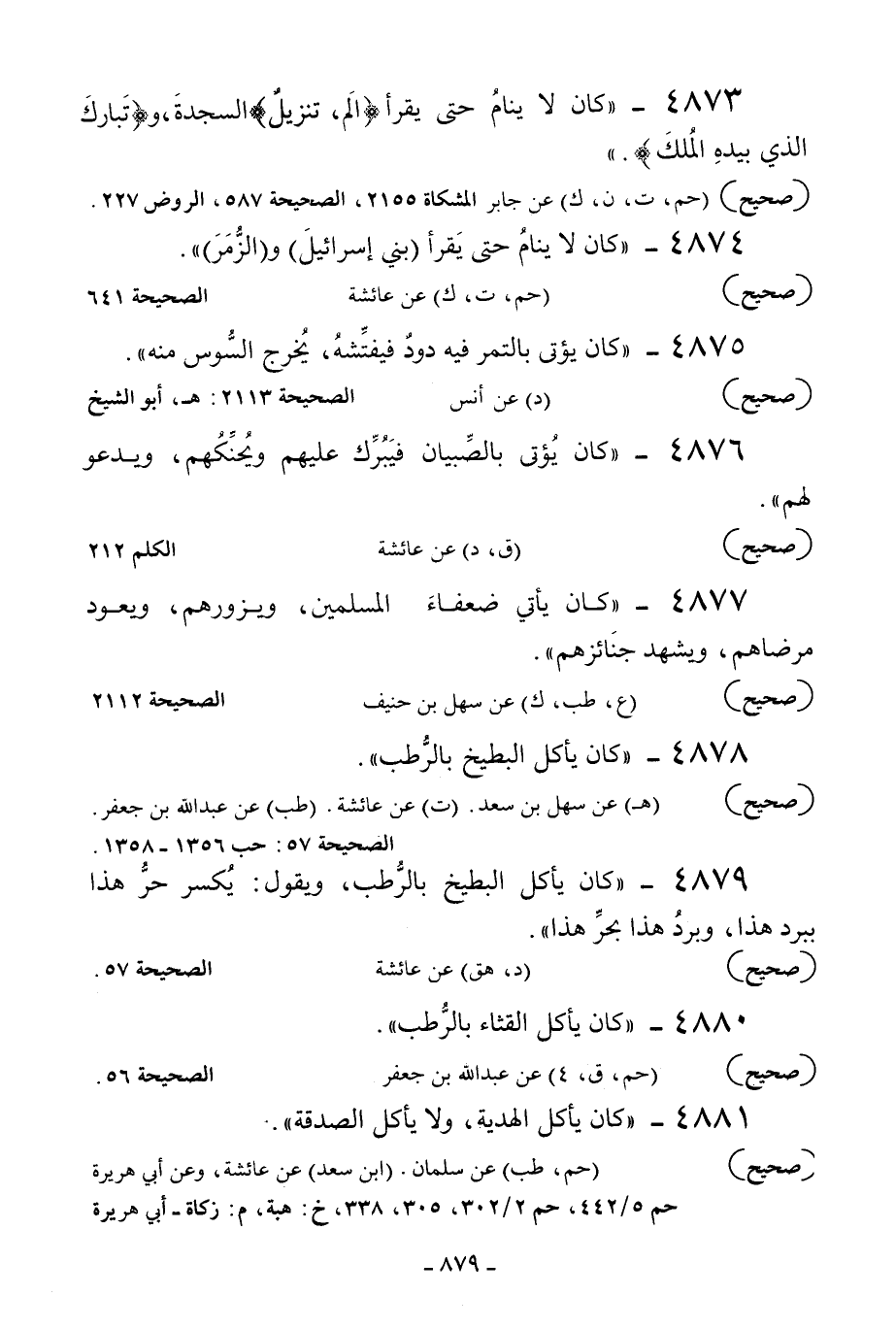 4879 - «كان يأكل البطيخ بالرطب ويقول: يكسر حر هذا ببرد هذا وبرد هذا بحر هذا» .