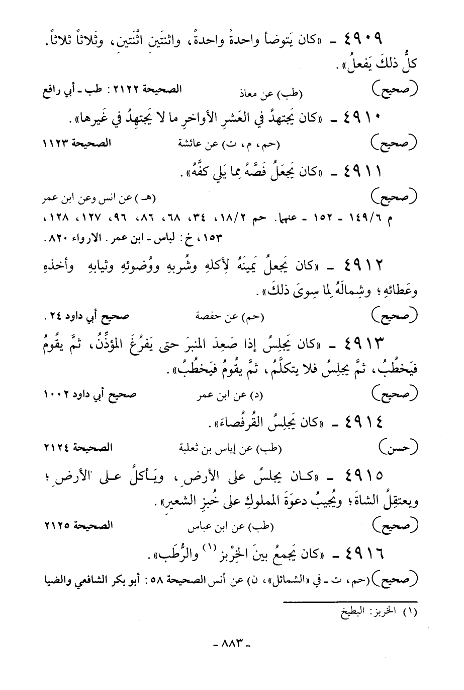 4915 - «كان يجلس على الأرض ويأكل على الأرض ويعتقل الشاة ويجيب دعوة المملوك على خبز الشعير» .