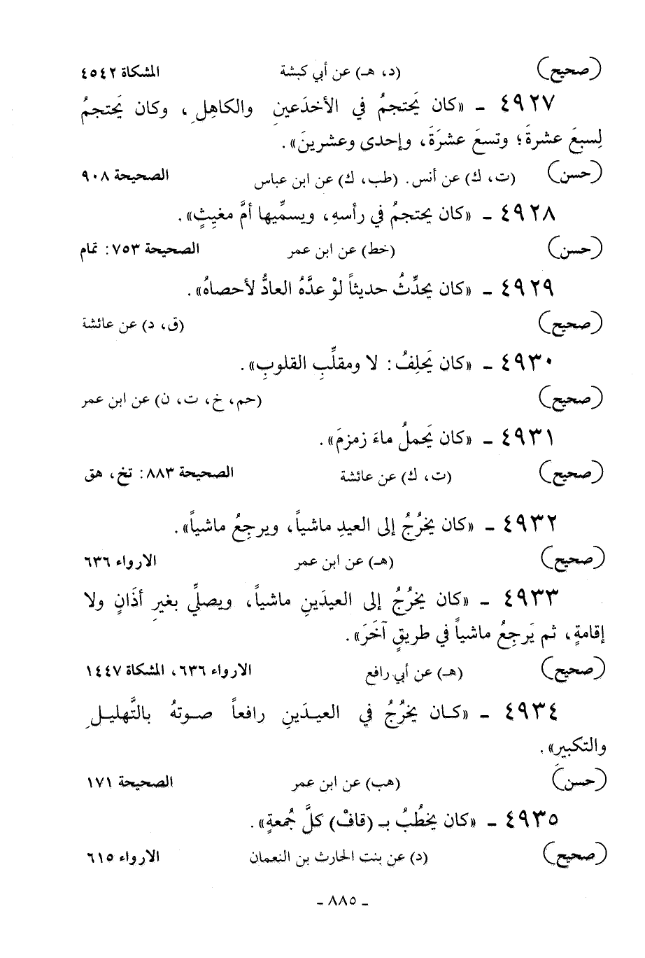 4932 - «كان يخرج إلى العيد ماشيا ويرجع ماشيا» .