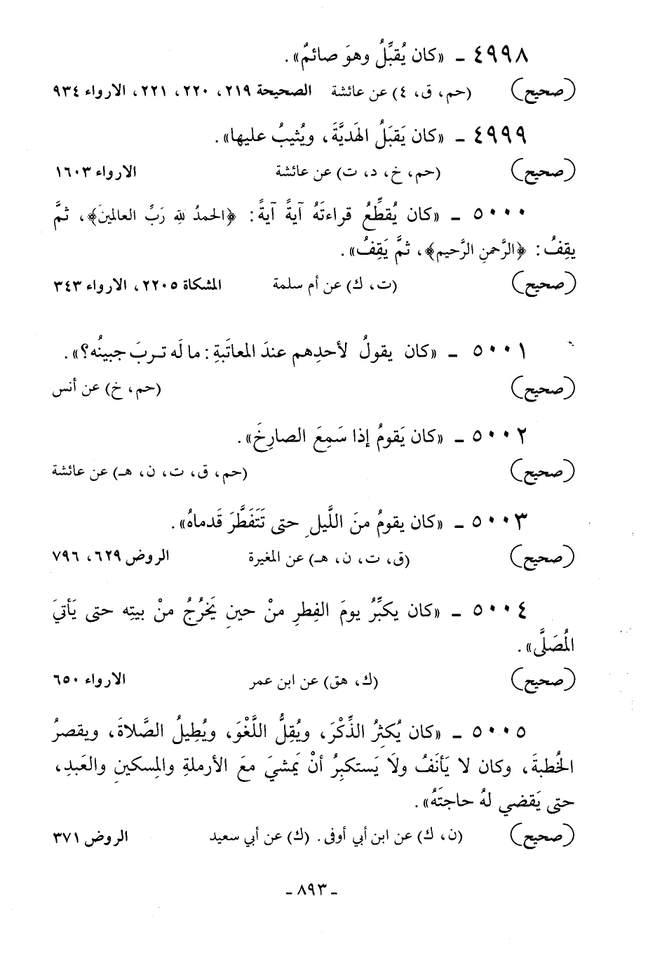 5000 - «كان يقطع قراءته آية آية: {الْحَمْدُ لِلَّهِ رَبِّ الْعَالَمِينَ} ثم يقف: {الرَّحْمَنِ الرَّحِيمِ} ثم يقف» .
