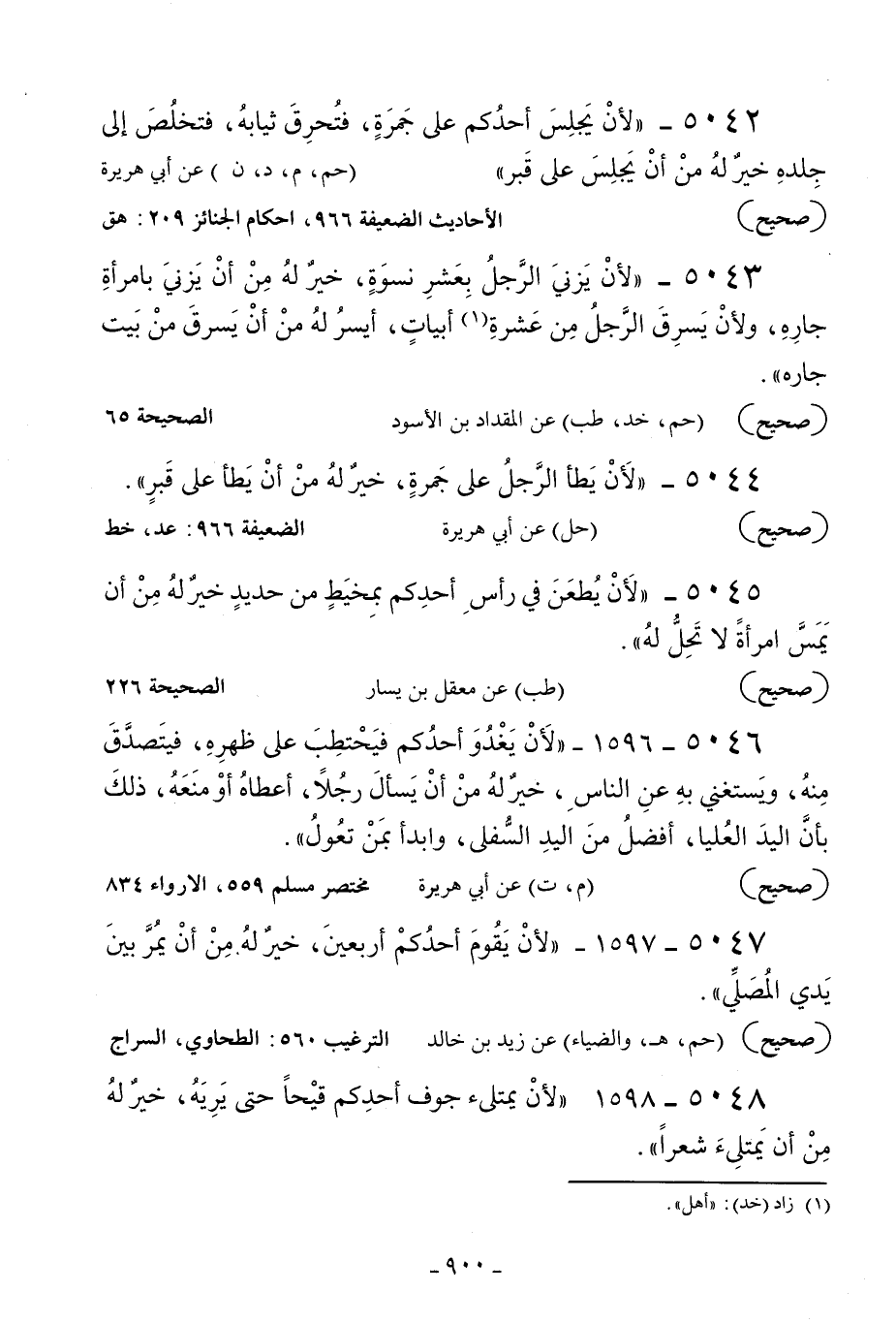 5042 - «لأن يجلس أحدكم على جمرة فتحرق ثيابه فتخلص إلى جلده خير له من أن يجلس على قبر» ... [حم م د ن] عن أبي هريرة.