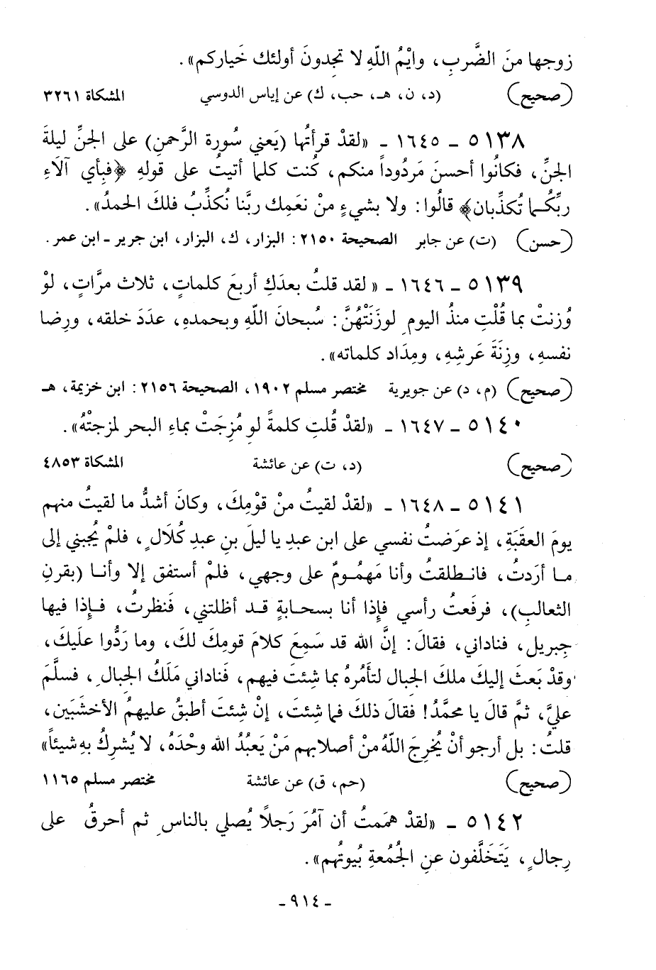 5139 - 1646 - «لقد قلت بعدك أربع كلمات ثلاث مرات لووزنت بما قلت منذ اليوم لوزنتهن: سبحان الله وبحمده عدد خلقه ورضا نفسه وزنة عرشه ومداد كلماته» .