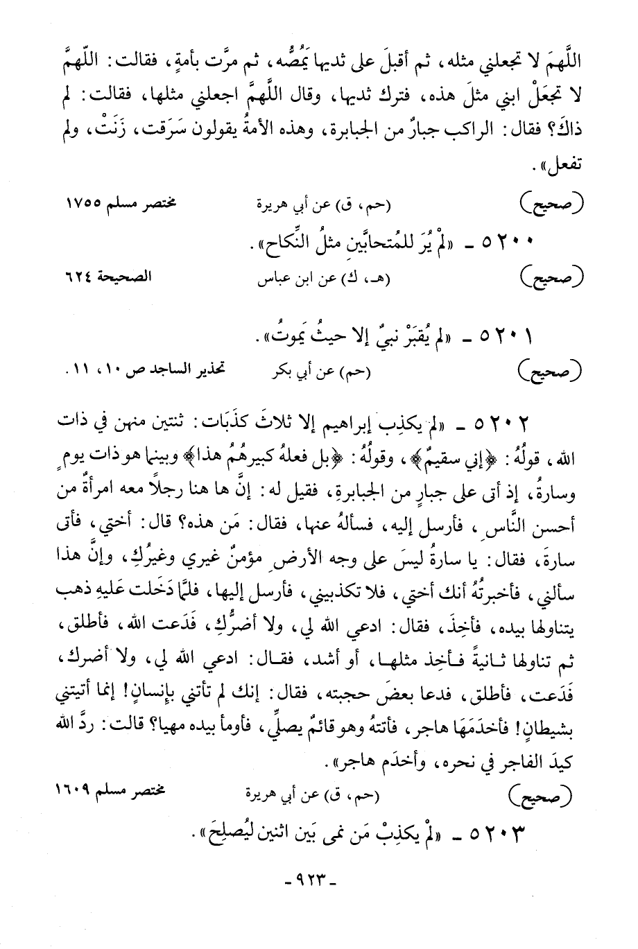 5202 - «لم يكذب إبراهيم إلا ثلاث كذبات: ثنتين منهن في ذات الله قوله: {إِنِّي سَقِيمٌ} وقوله: {بَلْ فَعَلَهُ كَبِيرُهُمْ هَذَا} وبينما هو ذات يوم وسارة إذ أتى على جبار من الجبابرة فقيل له: إن هاهنا رجلا معه امرأة من أحسن الناس فأرسل إليه فسأله عنها فقال: من هذه؟ قال: أختي فأتى سارة فقال: يا سارة ليس على وجه الأرض مؤمن غيري وغيرك وإن هذا سألني فأخبرته أنك أختي فلا تكذبيني فأرسل إليها فلما دخلت عليه ذهب يتنأولها بيده فأخذ فقال: ادعي الله لي ولا أضرك فدعت الله فأطلق ثم تناولها ثانية فأخذ مثلها أو أشد فقال: ادعي الله لي ولا أضرك فدعت فأطلق فدعا بعض حجبته فقال: إنك لم تأتني بإنسان! إنما أتيتني بشيطان! فأخدمها هاجر فأتته وهو قائم يصلي فأومأ بيده مهيا؟ قالت: رد الله كيد الفاجر في نحره وأخدم هاجر» .