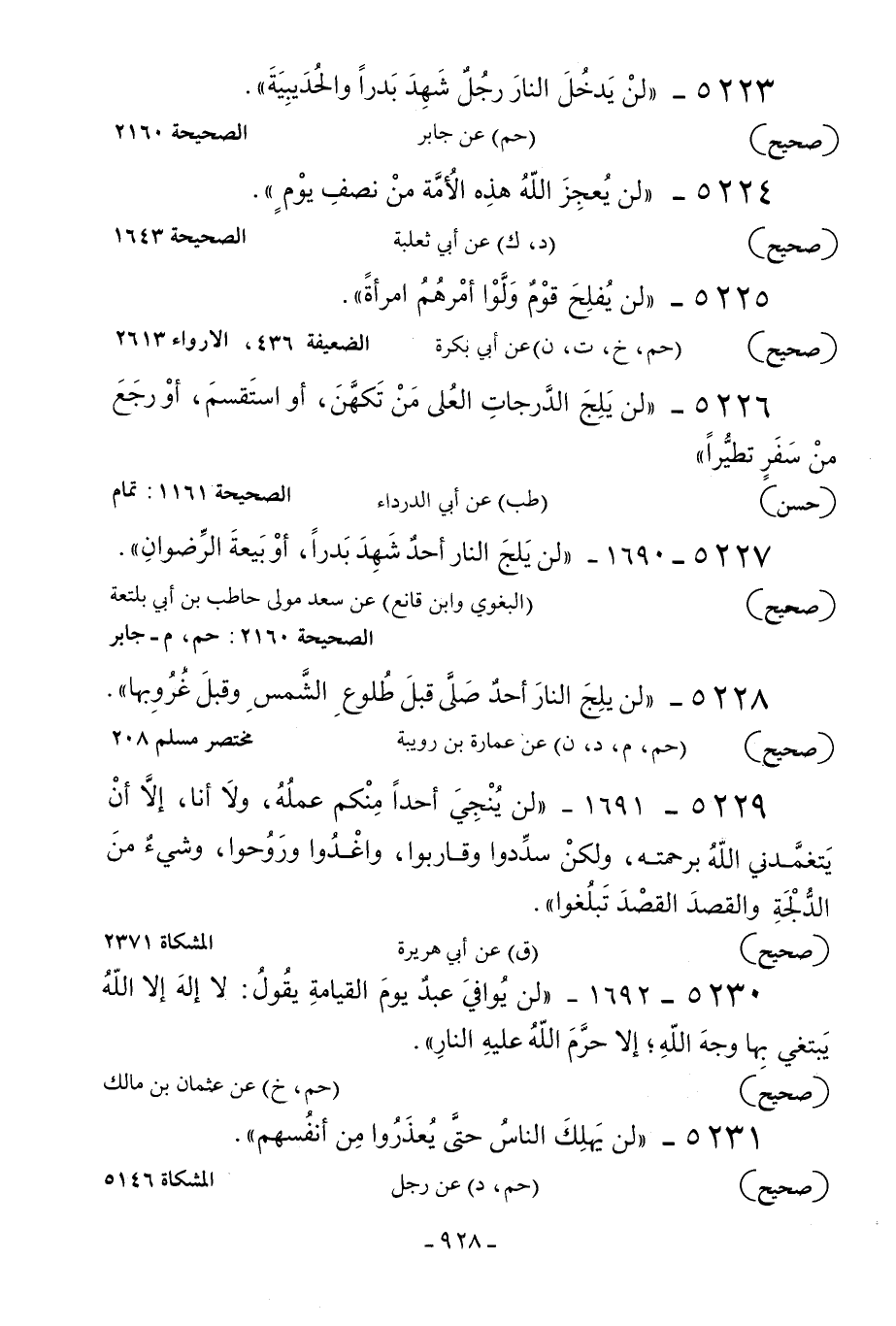 5226 - «لن يلج الدرجات العلى من تكهن أو استقسم أو رجع من سفر تطيرا» .