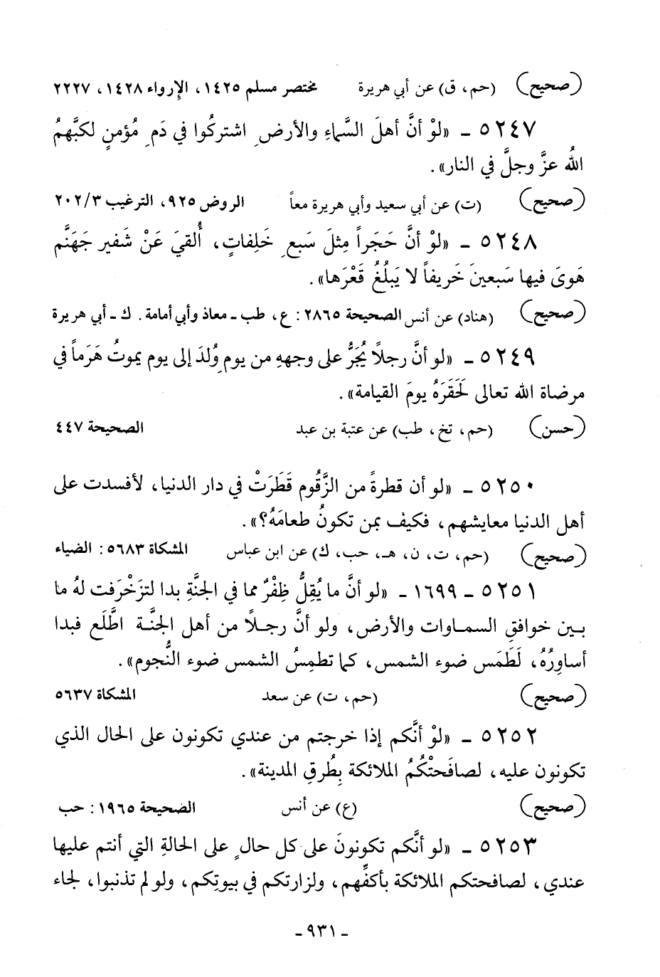 5248 - «لو أن حجرا مثل سبع خلفات ألقي عن شفير جهنم هوى فيها سبعين خريفا لا يبلغ قعرها» .