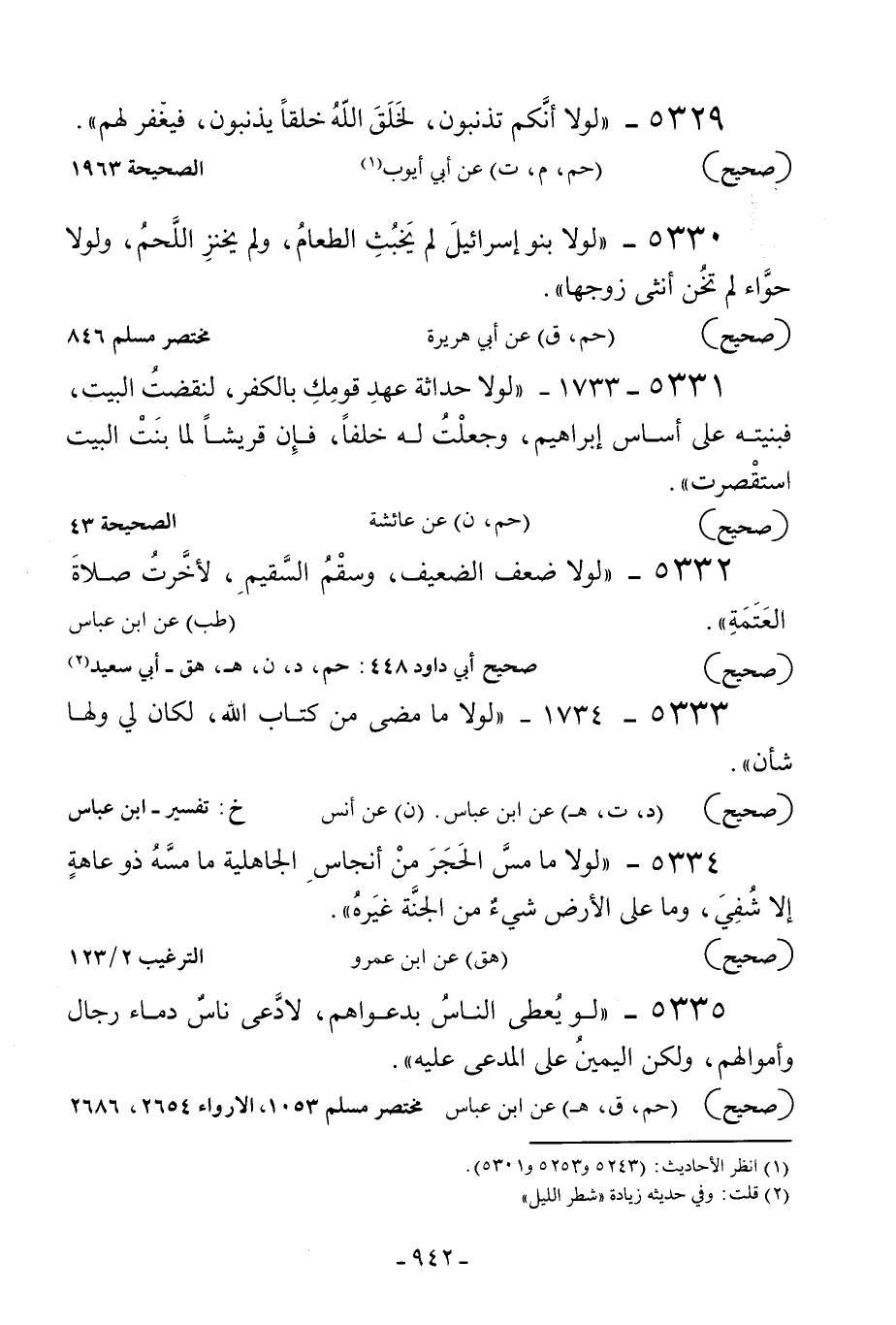 5331 - 1733 - «لولا حداثة عهد قومك بالكفر لنقضت البيت فبنيته على أساس إبراهيم وجعلت له خلفا فإن قريشا لما بنت البيت استقصرت» .