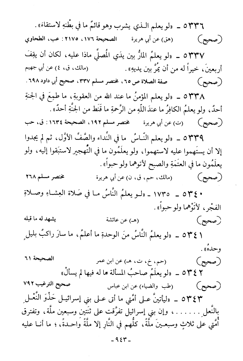 5339 - «لو» يعلم الناس ما في النداء والصف الأول ثم لم يجدوا إلا أن يستهموا عليه لاستهموا ولو يعلمون ما في التهجير لاستبقوا إليه ولو يعلمون ما في العتمة والصبح لأتوهما ولو حبوا".